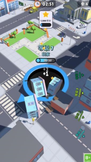 1、繁华市中心、绿意公园、复古街区,每场景含30层递进难度,最终目标是把整座城市吸成平地。